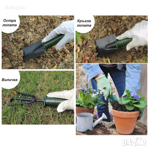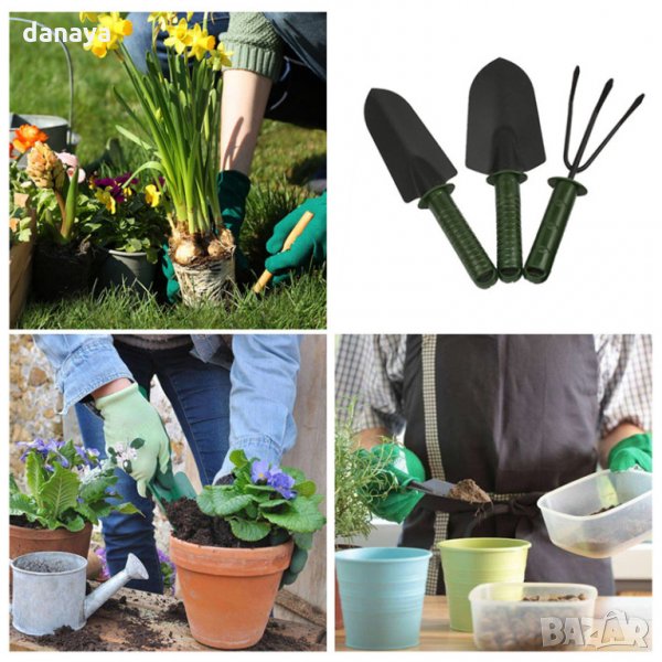Комплект мини градински инструменти, подходящи за разкопаване и разрохкване на почвата, почистване на плевели, засаждане на цветя. С тях лесно може да изваждате грудки и да оформяте пространството за засаждане. Комплектът се състои от 2 броя лопатки и разрохквател. Изработени от некорозивна стомана с допълнително покритие от черна боя. Дръжките са пластмасови.