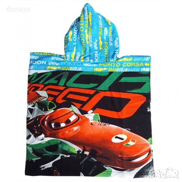 Плажно пончо за деца в ярки цветове. Пончото е с принт на обичаният филмов герой Маккуин. Удобен плажен халат с голяма качулка и атрактивен принт, който впечатлява децата. Супер мекичка детска хавлия пончо! Подходящо за деца до 10 годишна възраст или височина на детето до 130см.