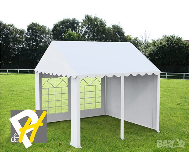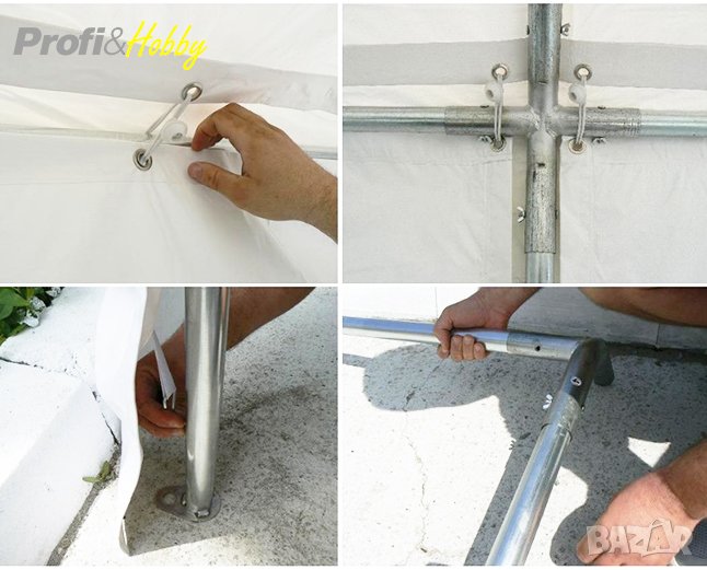 Тази шатра разполага с много лесна за монтиране конструкция от поцинкована стомана с антикорозионна защита и подсилен PVC брезент с тегло 500 г/м2. По-здравият покривен материал осигурява висока слънцезащита UV 80+, издържа на силен вятър и е 100% водоустойчив.