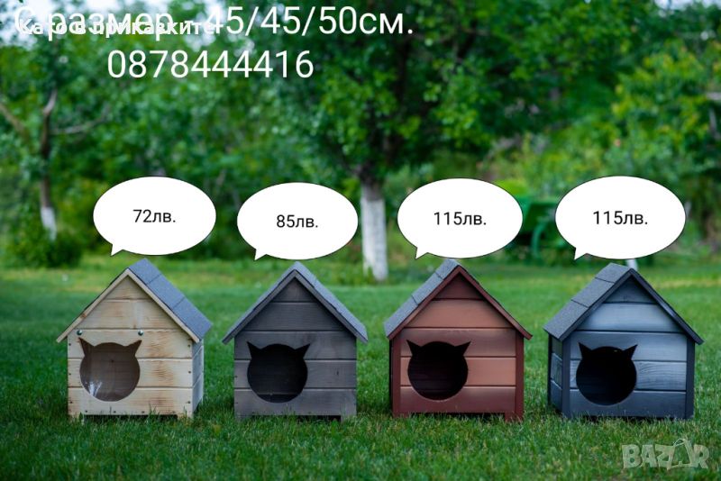 Перфектната къща за коте. Подходяща е за използване, както на открито в двора, така и в закрити помещения, като например вашата всекидневна, тераса или коридор. Къщите за котета са изключително прецизно изработени, като при тяхното конструиране са използвани единствено и само висококачествени материали, което ги прави красиви и в същото време здрави и напълно безопасни за вашите котета. Дървеният материал използван при изработката на къщата за котета е от импрегнирана и добре обработена иглолистна дървесина. Използваме единствено и само екологични и високоефективни лепила и консумативи, които гарантират за максималната безопасност на вашето коте и безупречната устойчивост на къщата срещу атмосферни влияния и други вредители.Разполага с монтирани крачета, за по-лесно преместване и транспортиране, а същевременно по този начин къщата за котета е по-високо от земята, което допринася за по-добрата топлоизолация.Къща за котка - Ретро 60лв.Доставка до офис на Еконт - 11лв.Дължина:42см.Ширина:42см.Височина:42см.Светъл отвор:18см.Къща за котка - РетроРазмер: С - 72лв.Дължина:45см.Ширина:45см.Височина:50см.Светъл отвор:18см.Размер: М - 105лв.Дължина:64см.Ширина:60см.Височина:68см.Светъл отвор:18см.Къща за котка - Винтидж 70лв.Доставка до офис на Еконт - 11лв.Дължина:452м.Ширина:42см.Височина:42см.Светъл отвор:18см.Къща за котка - ВинтиджРазмер: С - 85лв.Дължина:45см.Ширина:45см.Височина:50см.Светъл отвор:18см.Размер: М - 115лв.Дължина:64см.Ширина:60см.Височина:68см.Светъл отвор:18см.Къща за коте - СиваРазмер: С - 115лв.Дължина:45см.Ширина:45см.Височина:50см.Светъл отвор:18см.Размер: М - 149лв.Дължина:64см.Ширина:60см.Височина:68см.Светъл отвор:18см.Къща за котка - Кафява 90лв.Доставка до офис на Еконт - 11лв.Дължина:42см.Ширина:42см.Височина:42см.Светъл отвор:18см.Къща за котка - КафяваРазмер: С - 115лв.Дължина:45см.Ширина:45см.Височина:50см.Светъл отвор:18см.Размер: М - 149лв.Дължина:64см.Ширина:60см.Височина:68см.Светъл отвор:18см.Аксесоари:-Врата от PVC(Кристал)-2 броя метални купи в дървена стойка-Легло от водонепромокаем платМоже да разгледате в другите ни обяви!-Ръчно изработени-Безвредни боя и лак на водна основа.-Естествена дървесина-Произведени в БългарияНаучи повече на тел.: 0878444416