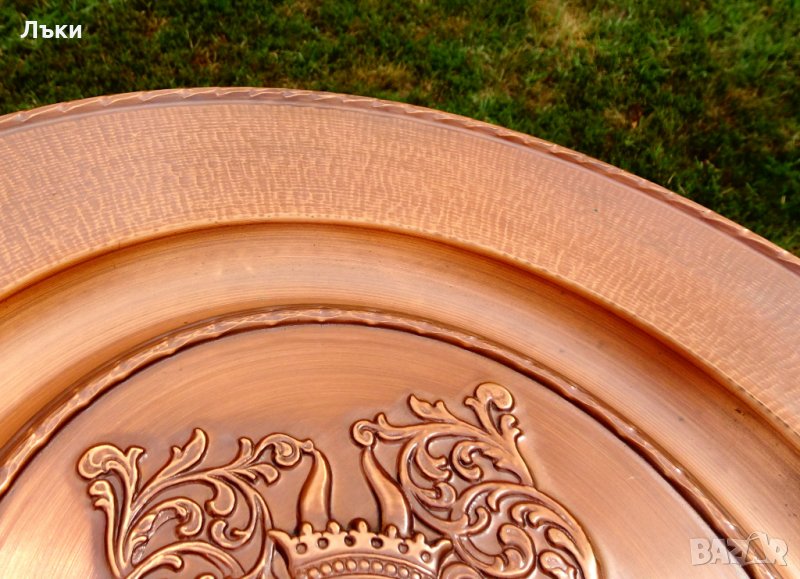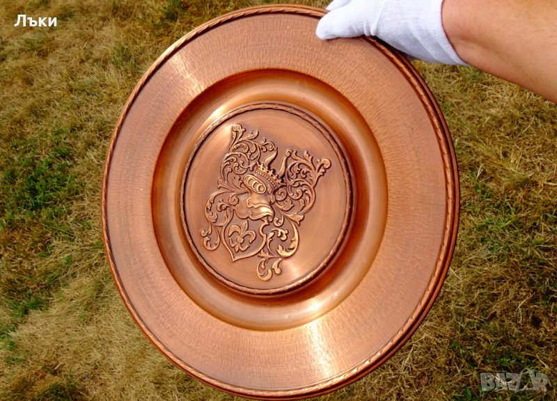 изработка от масивна чиста мед с релефно ковано изображение на Рицар,рицарски доспехи,корона,бурбонска лилия и красиви барокови орнаменти.Диаметър 39 см.,височина 3 см.,тегло 700 гр.Има стабилна окачалка за стена.