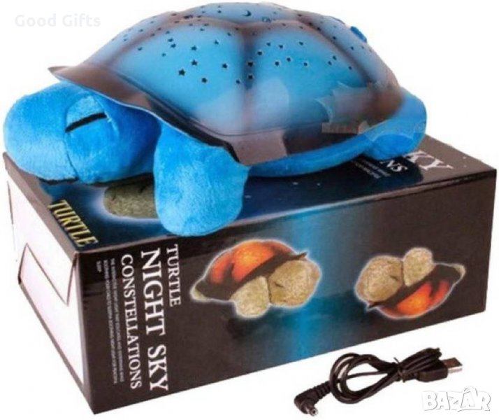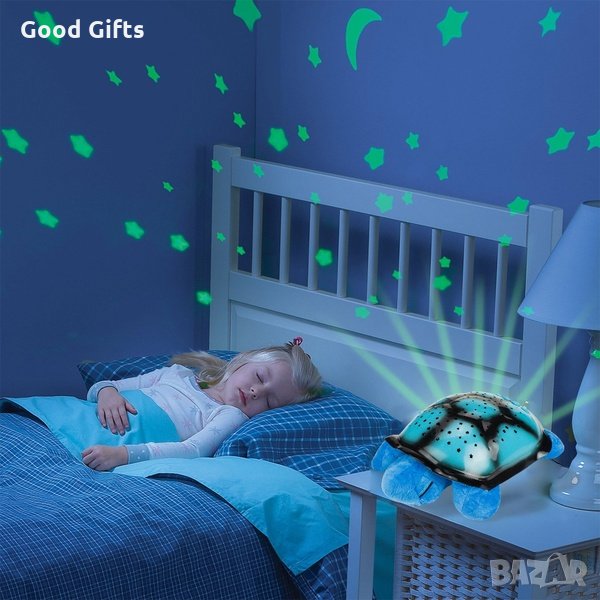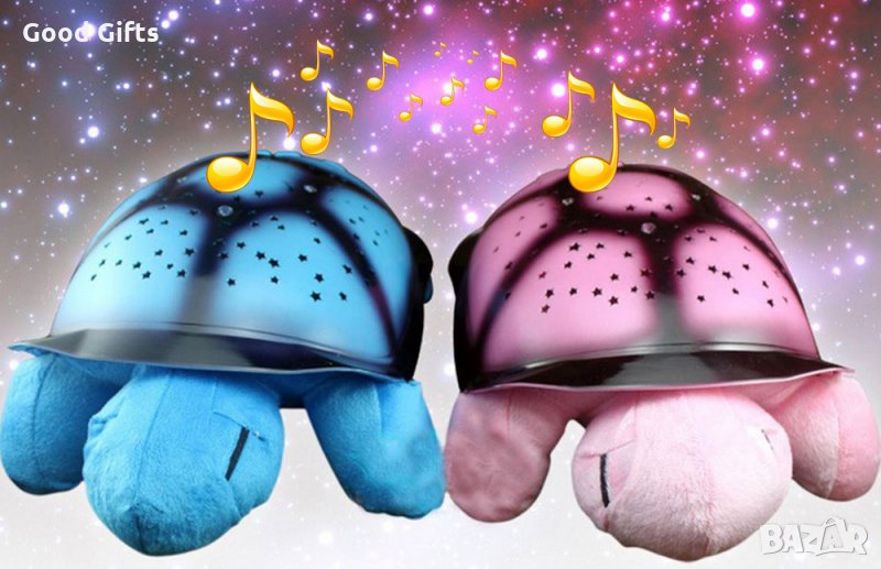 Музикална магическа нощна лампа костенурка, която проектира 7 различни съзвездия в 4 цвята и 4 приятни мелодии. Перфектна компания за сън за деца от всички възрастови групи. Уникалните възможности на детската нощна лампа се крият в нейната черупка, която чрез малките си отвори излъчва съзвездие, което се проектира в стаята на детето – по стените и тавана. Предлага се в синьо, зелено, розово и кафяво!