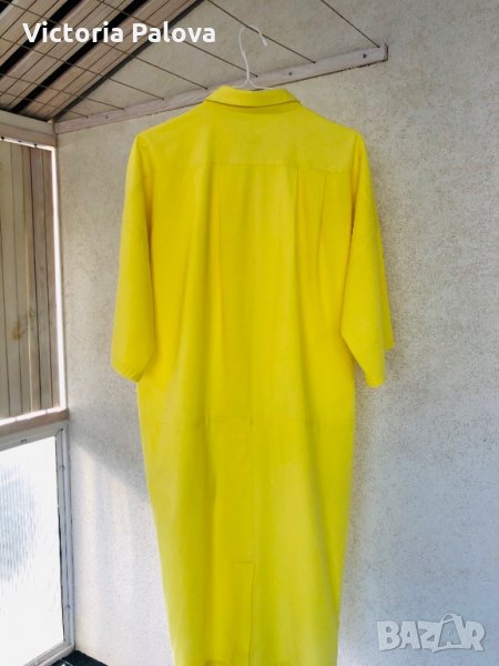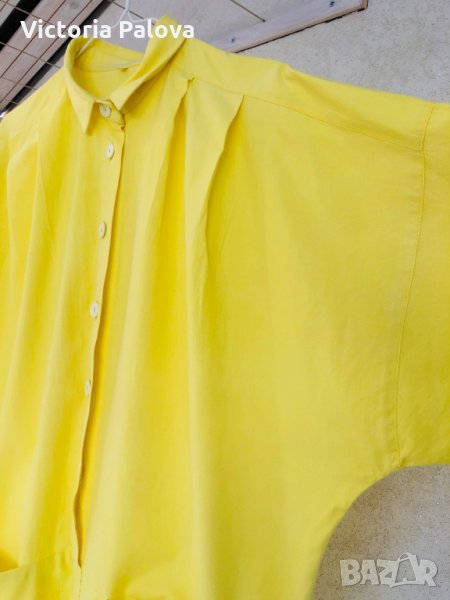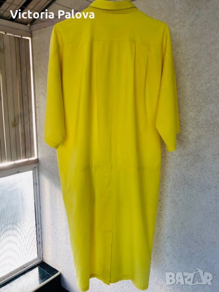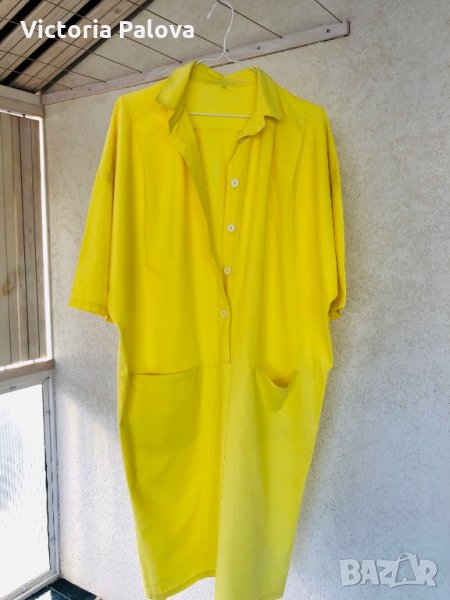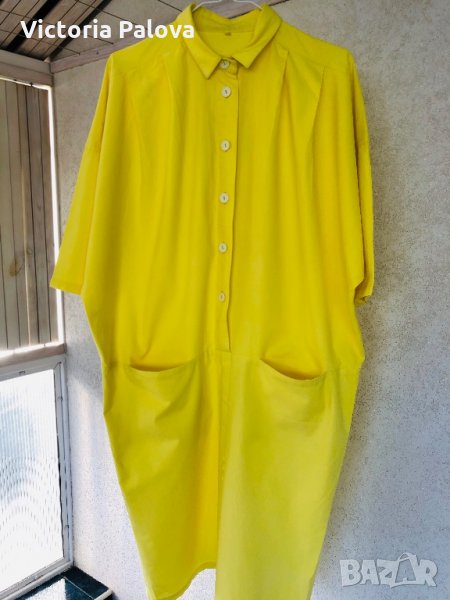 Много красива рокля ,гладък мек памук,кройката е без размер горе,паднало рамо,което се драпира много красиво.цветът е наситен,красив и ярък.посочен е 38 размер,но роклята може да пасне и на L заради кройката.напречният шев е 60-61см,цялата дължина е 112-113см,кройката е кокон,стеснява се надолу.