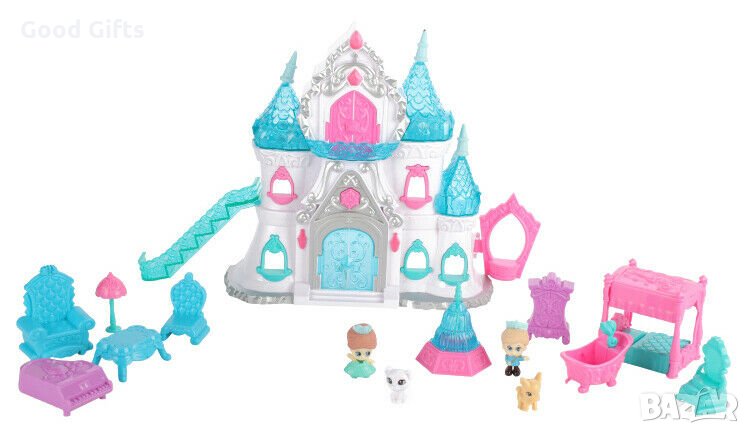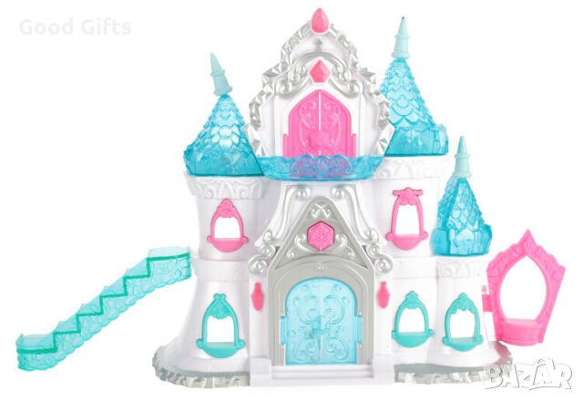 замък, мини фигурки на принцеса Елза и Кристоф и всички аксесоари, които са задължителни за обзавеждането на един замък. Замъкът е на три нива, с отварящи се вратички. С натискането на един бутон Леденият замък оживява, като се задейства светлинно шоу и приятна мелодия, допълнение, което ще зарадва всяко мъниче.
