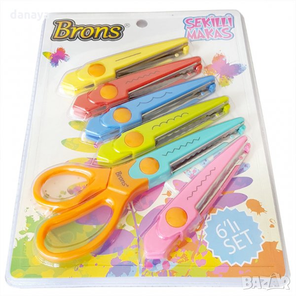 Ножица за къдраво рязане. Ученическа ножица за хартия, чрез която се създават красиви апликации и картички. Ножицата е със заоблени върхове. Има 6 сменяеми приставки, режещи различно. Чудесен ученически комплект за декорация и работа с хартия.