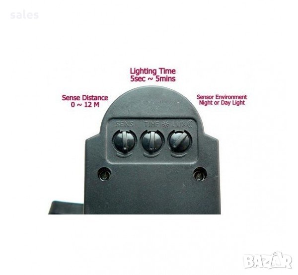 PIR датчикът автоматично включва ЛЕД лампата , с обхват на детекция до 12м. Има 3 бутона за настройка - таймер, чувствителност и количеството светлина.