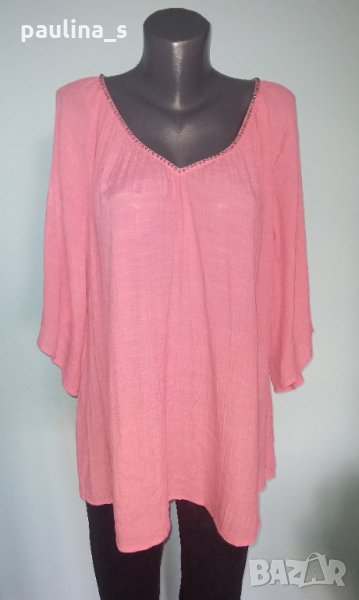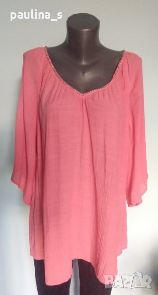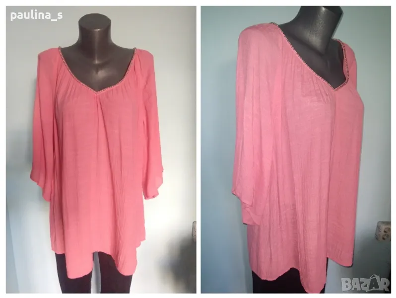 1. Колаж / XL / 4XL - "Zizzy". Цената е крайна 34,99лв. Туника де лукс с декорации на деколтето - унисайз. Платът е кенар - фабрично измачкана, 70% фин памук, 30% коприна. Дрехата е много впечатлителна и удобна, като нова. Цветът е цикламено розов.
