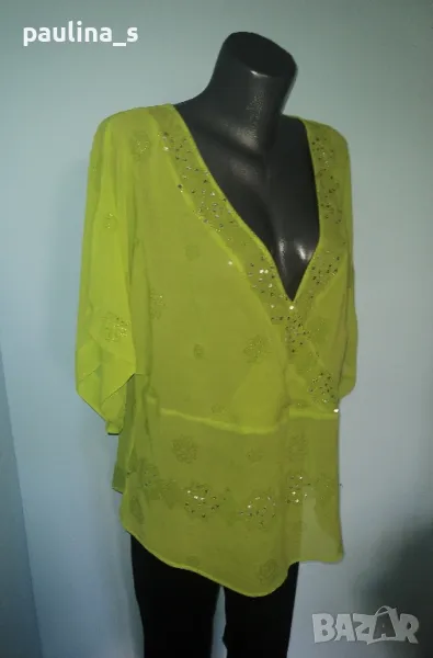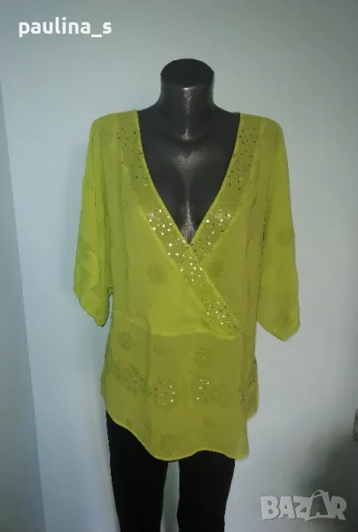 3. Колаж / XL / 3XL - Зелена туника - ефирна органза. Цената е крайна 29,99лв. Туника с декорации от пайети и прекръстосано деколте, може и плажна туника. Материята е ефирна органза на цветя, цветът е неоново зелен. Моделът не лимитира гръдната обиколка за сметка на дълбочината на деколтето, цвят - неоново зелен.