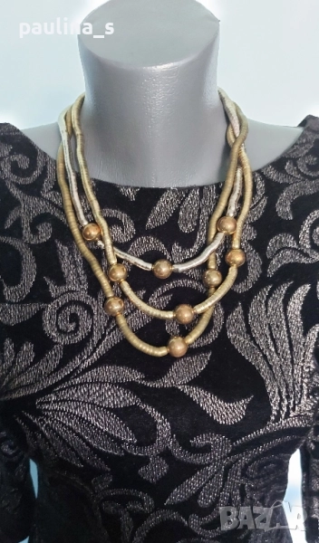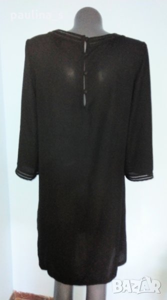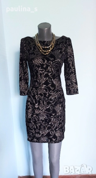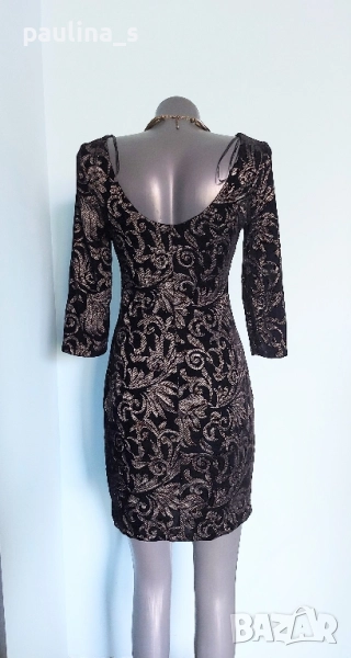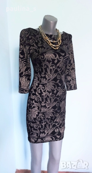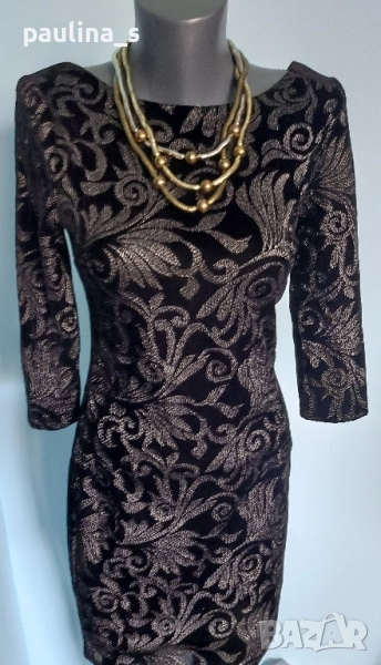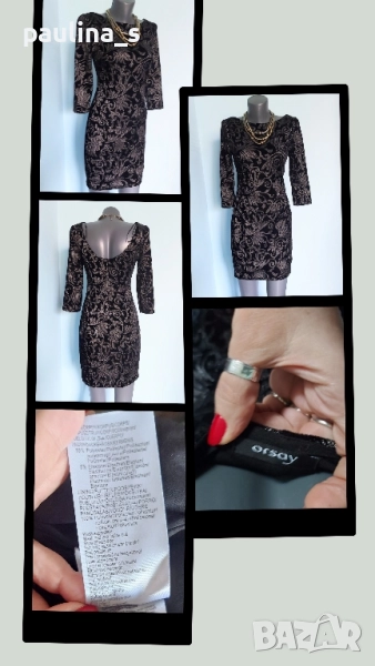 2️⃣. Колаж / S / M - "Orsay". Цената е крайна, без пазарлъци 29,99лв / 15 евро. Малка черна рокля със сребърен принт, за повод. Моделът е обран, с дълбок гръб и 7/8 ръкави. Има хастар, не прозира. Материята е еластична и покрива няколко размера, посочени са, една бройка, като нова. Колието е марково Parfois - Цената е крайна 19,99лв / 10 евро.