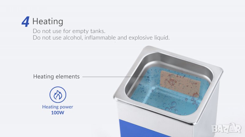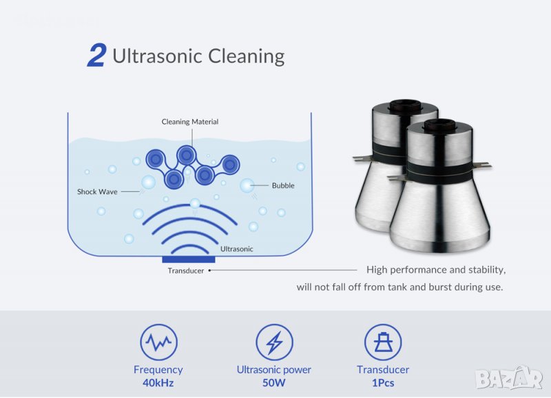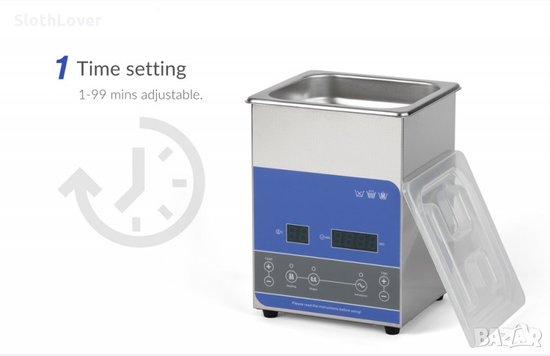 Премахва мръсотия, прах, мазнини дори и на най-малките места с ултразвукова технология. Работи с обикновенна вода, но при нужда може да работи и с препарат за ултравукови вани.