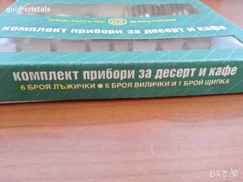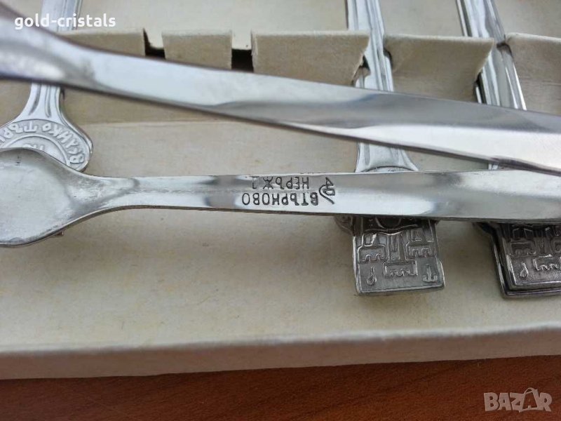 Комплект български прибори за хранене кафе десерт 6бр вилички 6бр лъжички и щипка маркирани неръждаеми велико търново сърп и чук сервиз комплект сет лот ретро арт декор винтидж колекция стари антикварни предмети обзавеждане за дома и семейството подходящи за подарък за ценители и колекционери