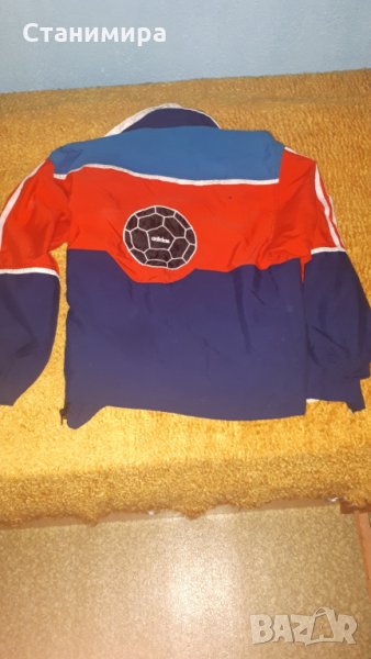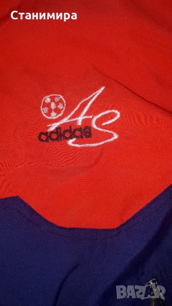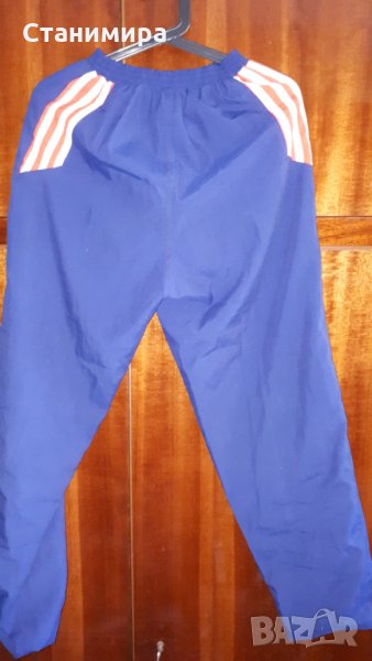 2, "Адидас" - Комплектът е носен само няколко пъти. Материята прилича на микрофибър. На етикета пише размер S, но мисля, че отговаря и на М (детско-юношеска номерация). Има малко петънце на якето, отзад, вижда се на снимките. - 6 лв.