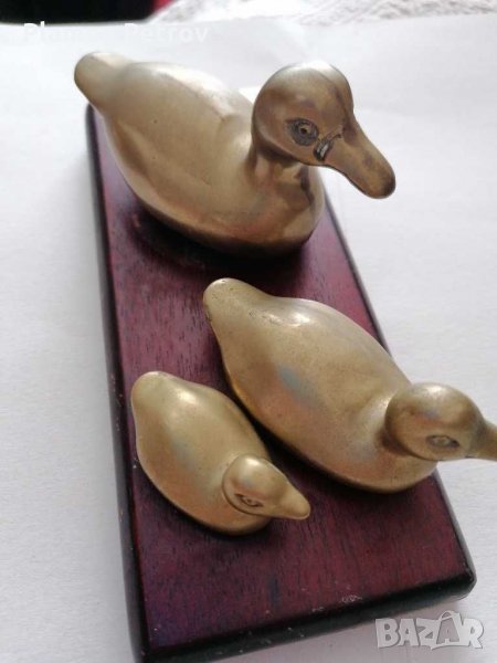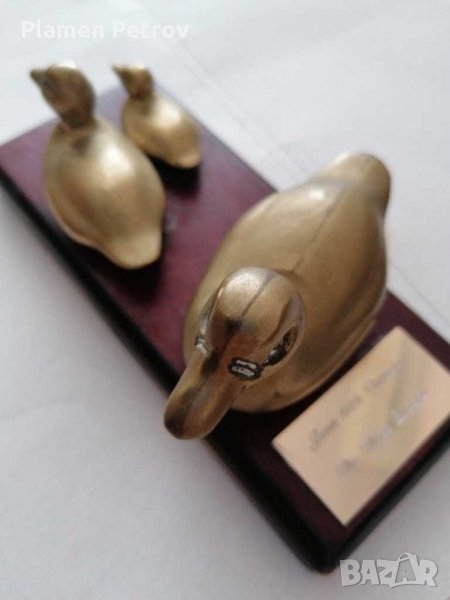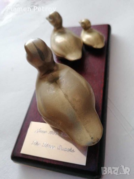 Стара композиция от три бронзови патета Канада 1989 година на дървен постамент дължина 18 см и ширина 7 см