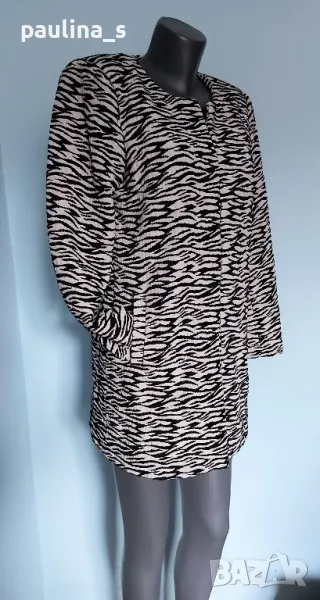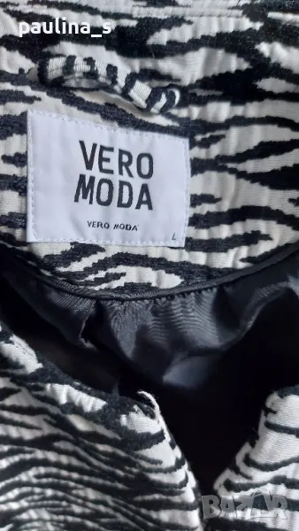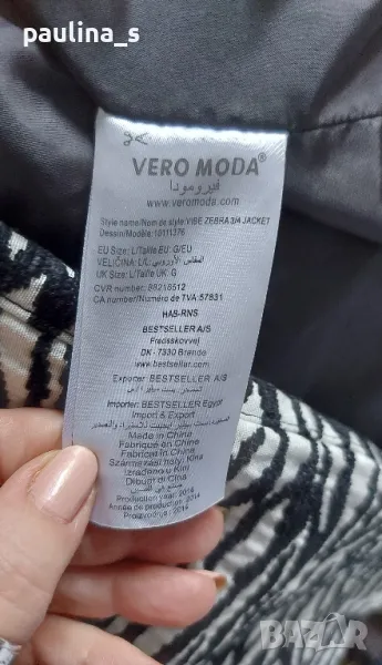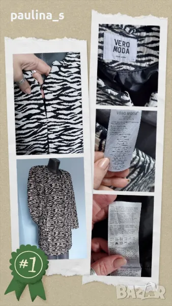 1️⃣. Колаж / L / XL "Vero Moda". Цената е крайна 64,99лв / 33 евро. Брандово преходно палто тип манто, в зебра шарка. Материята е релефен и ефектен микрофибър - плътен, немачкаем и много луксозен, със съдържание на памук, бялото е със седефен отблясък. Моделът е обран, втален, закопчава се със скрити секретни копчета. Може да се носи и като сако или връхна дреха в по-хладно време пролет и есен. Дрехата е много впечатлителна и елегантна. Лична колекция, нова, без дефекти. Не е носена, защото не ми става вече, купена от магазин на бранда в Цюрих.
