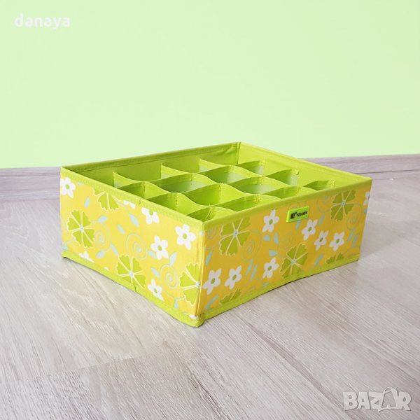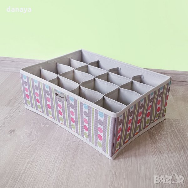 Сгъваема кутия за съхранение на чорапи, бельо, шалове и други дребни аксесоари. Текстилен органайзер за гардероб, чекмедже, шкаф, органайзер за под леглото. Свеж цветен принт, просто избери твоят десен. Органайзерът е сгъваем и лесно преносим, което го прави подходящ и за пътуване. 16 отделения.