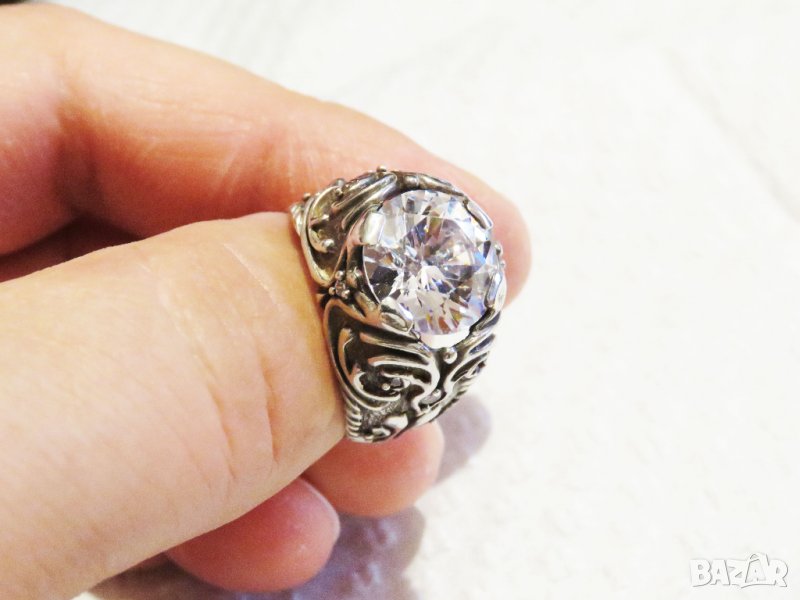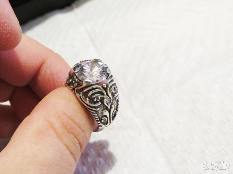 солиден кован пръстен, мъжки сребърен пръстен с голям красив циркон и множество камъчета сребро