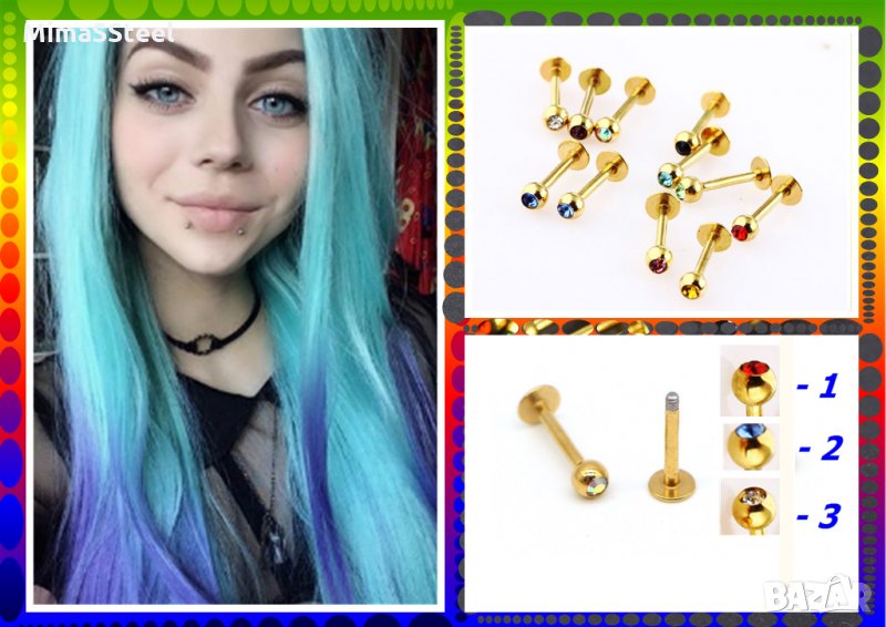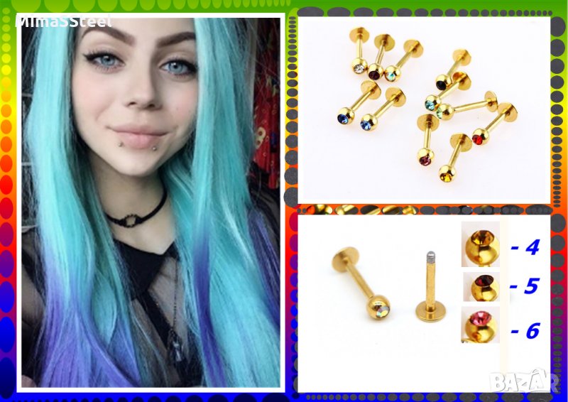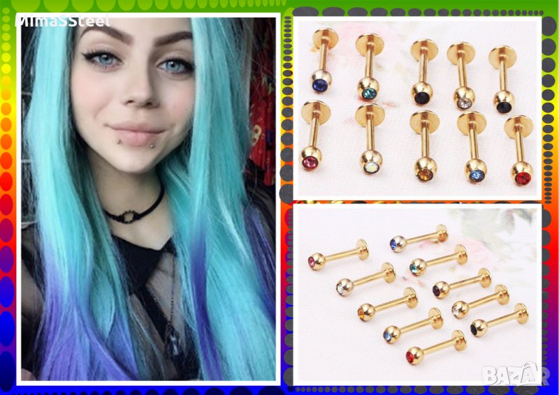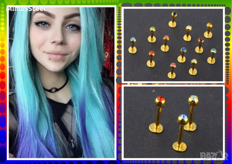 Обeца пиърсинг лабрет, за устна, ухо или където си прецените. Изработена от медицинска (хирургическа) стомана тип Stainless Steel 316L с цветно анодизирано 14 каратово златно покритие.