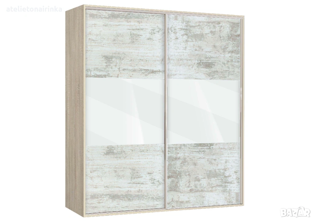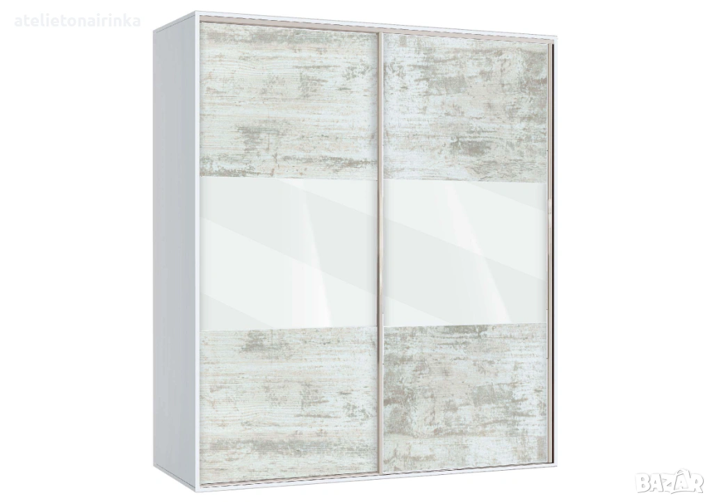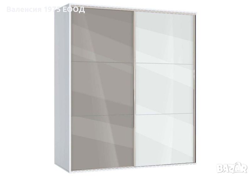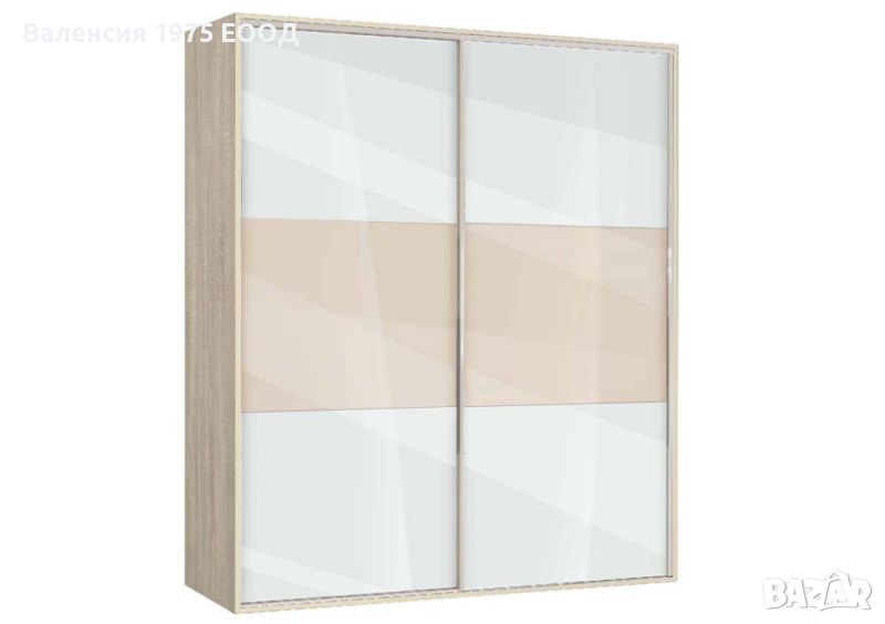 Гардероб с плъзгащи врати с по три панела,четири рафта и лост за закачалки.