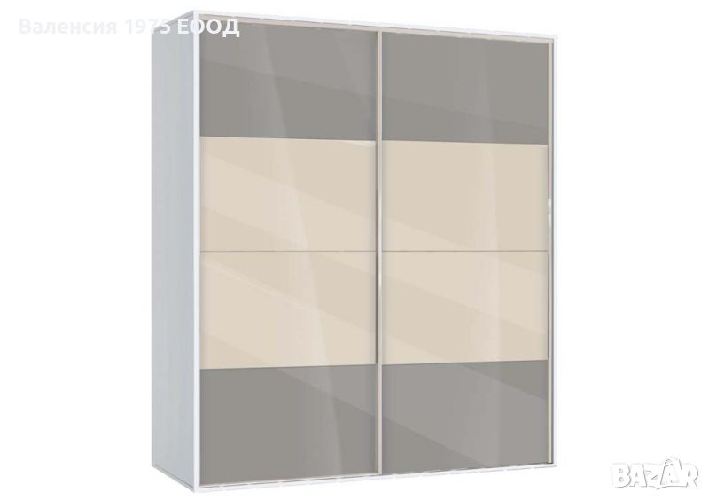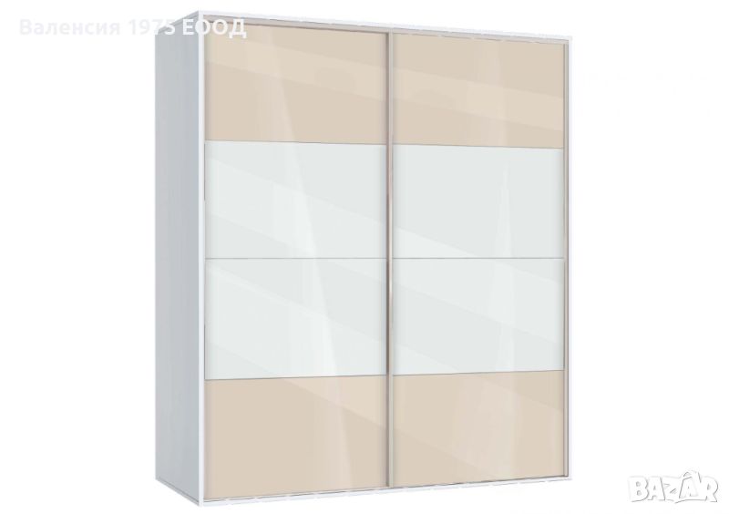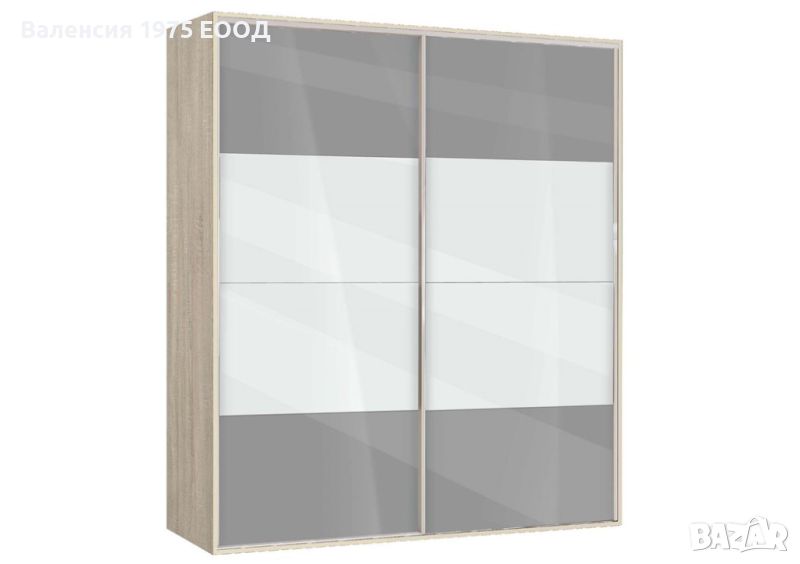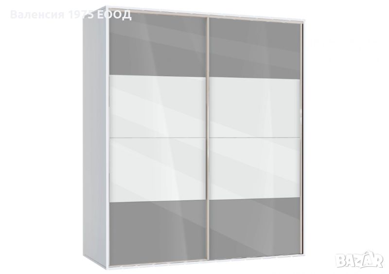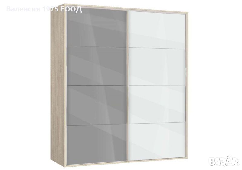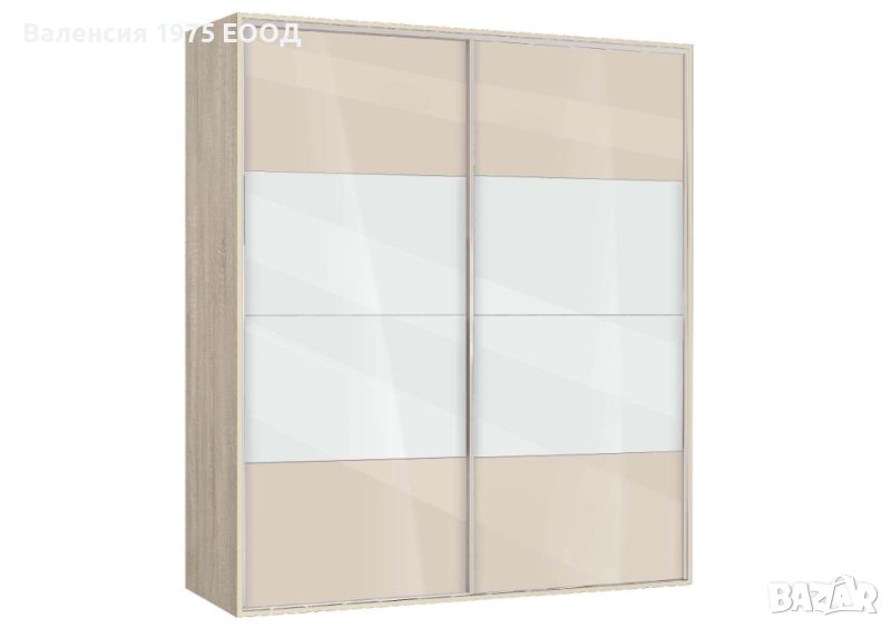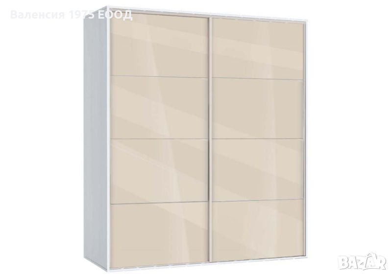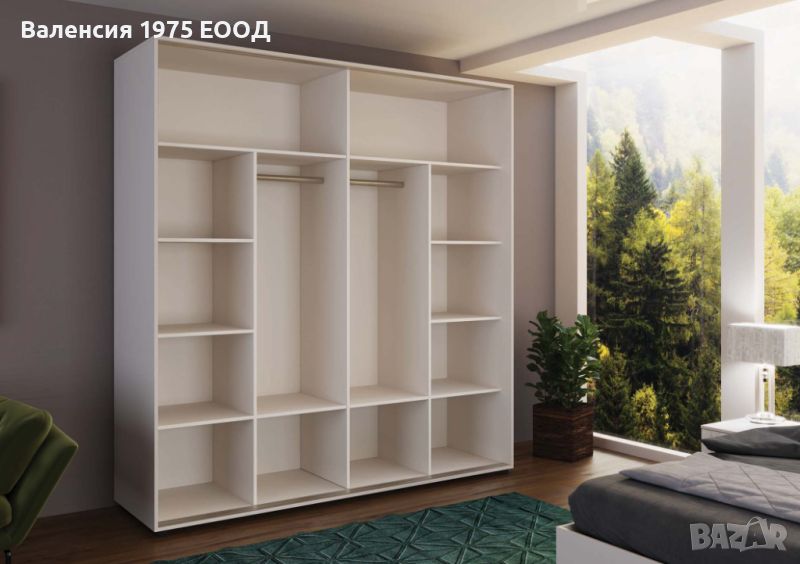 Гардероб с плъзгащи врати с по четири панела, вградена надстройка, осем рафта и два лоста за закачалки.