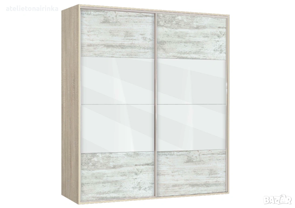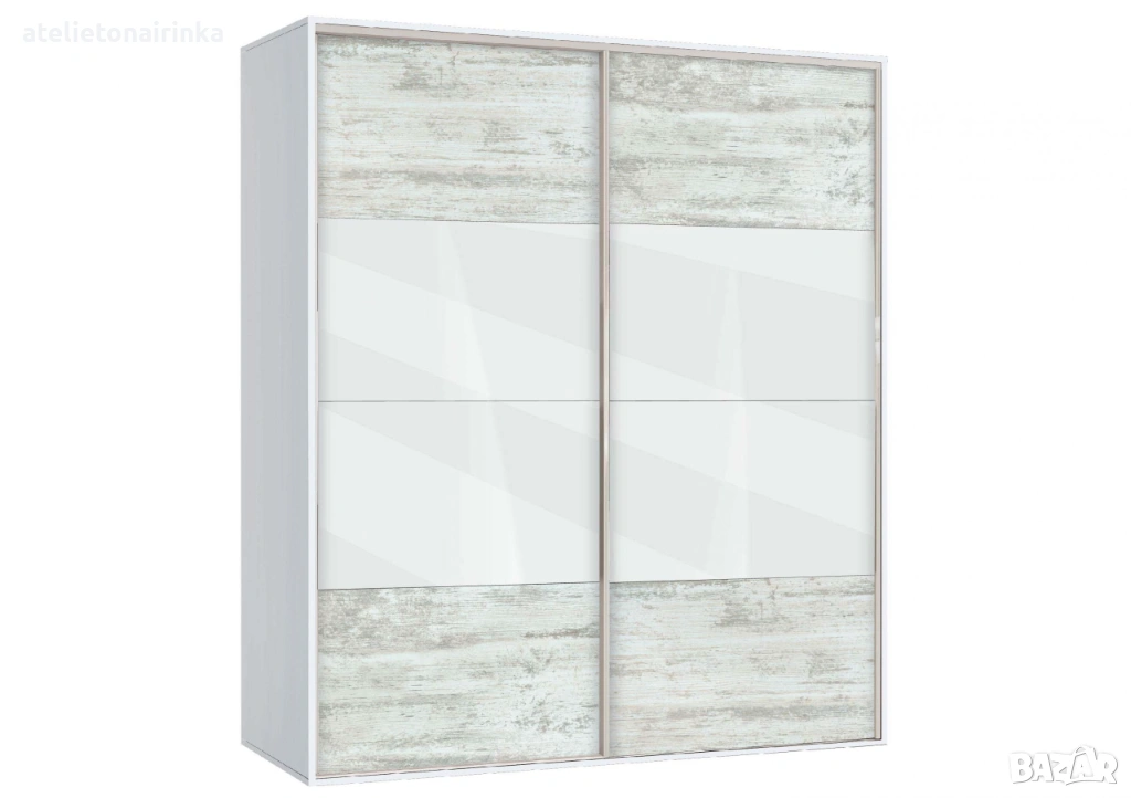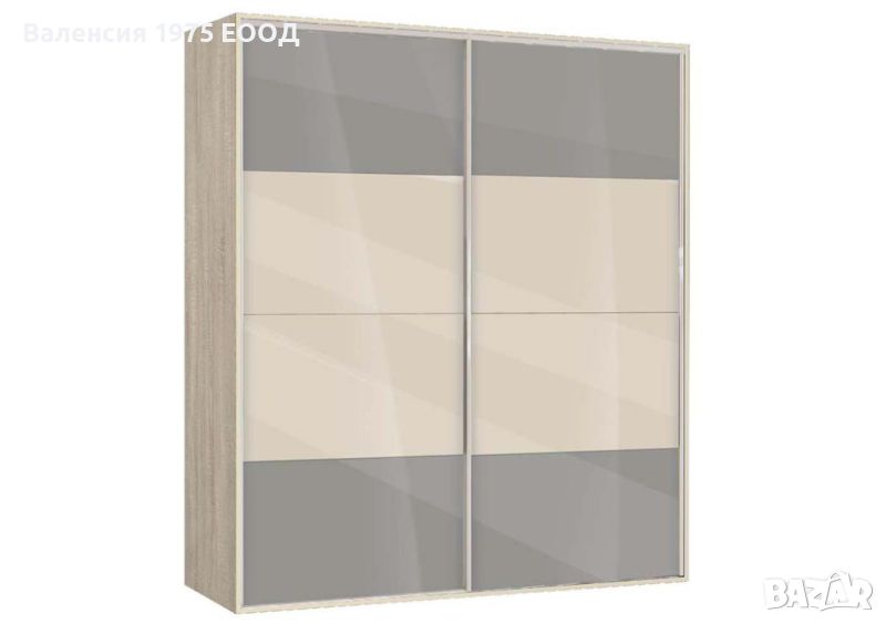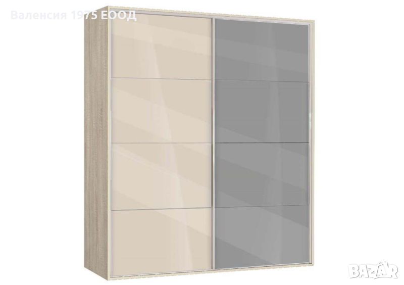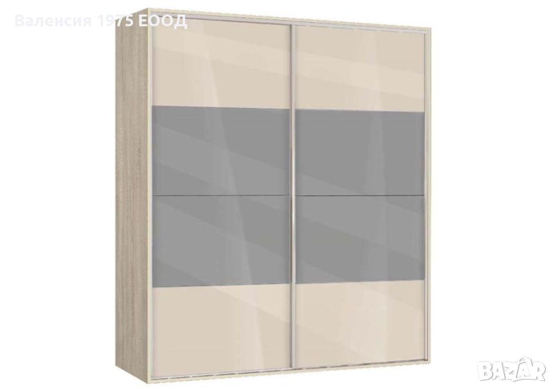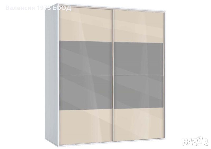 Гардероб с плъзгащи врати с по четири панела, вградена надстройка, осем рафта и два лоста за закачалки.
