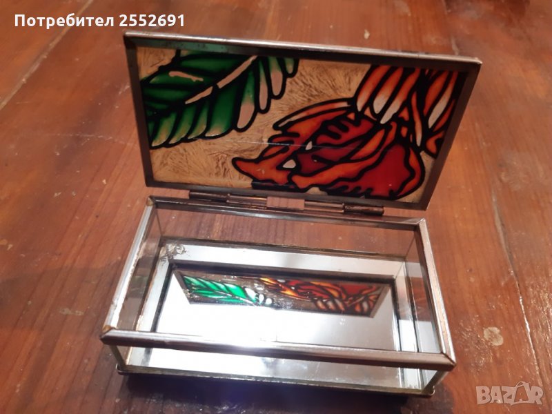 Стъклена, цветна кутия с огледално дъно и крачета. Размери-11/6/4см.