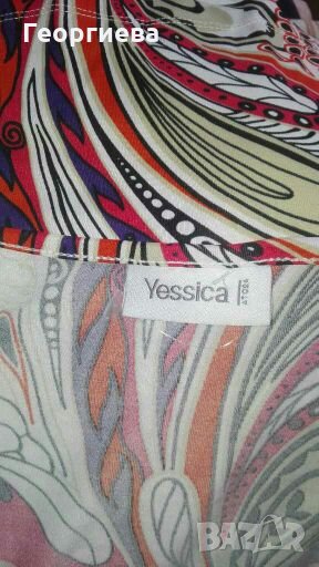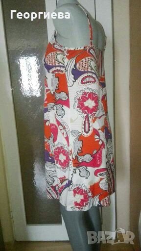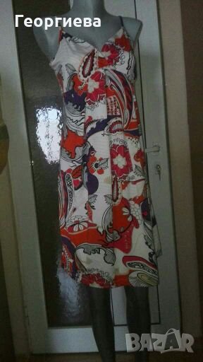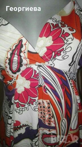 Роклята е силно еластична, не прозира и обхваща и по-голяма ГО(манекенът е с ГО 86см.)Материята е гладка, мека и не се мачка.Цветовете са контрастни и свежи.Нова е, без хартиен етикет.