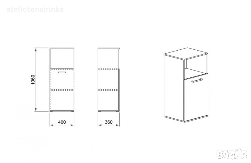 Етажерката е компактен модул от серията за офис обзавеждане "Гранд". Тя е проектирана като средно висока секция с дискретно място за съхранение зад врата.