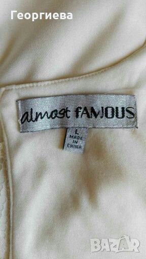 Красива елегантна рокля със свободна талия.Нова е, без хартиен етикет.Цвят слонова кост, материя смесена - памук и полиестер(вижте етикета.Размер по етикет L, но разгледайте и подробните размери: