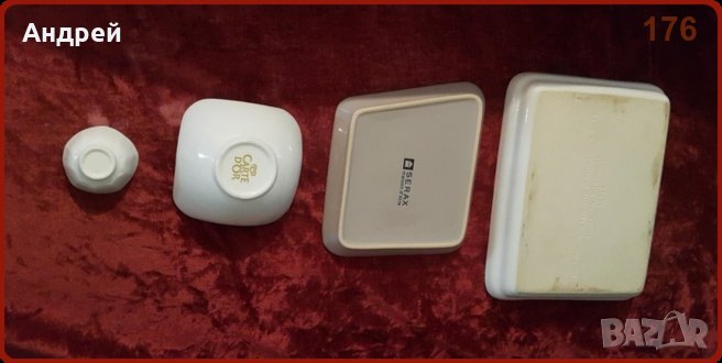 Лота се състои от четири съвсем различни порцеланови елемента: 1)порцеланов плакет(тавичка) в „изчистен“ бял цвят.За употребата и‘ оставям на Вашето въображение,а на дъното си има надпис удостоверяващ портогалския и‘ произход.Размери:дължина-27,7см.,ширина21,5см.,височина-4см. 2)порцеланово подносче за кафе,чай и т.н., с форма на неправилен четириъгълник и матов цвят.Размерите му са: дължина -20,3см.,ширина-18см.,и височина-2,5см. 3)порцеланов съд под формата на цвете,подходящ за ядки,бонбони и други подобни.Цветя е бял,а размерите,както следва:диаметър горе-15см,диаметър на дъното-6см.