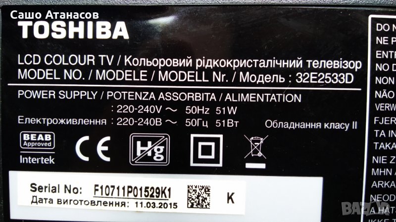 TOSHIBA 32E2533D със счупена матрица (панел U320DH01 DA102 )