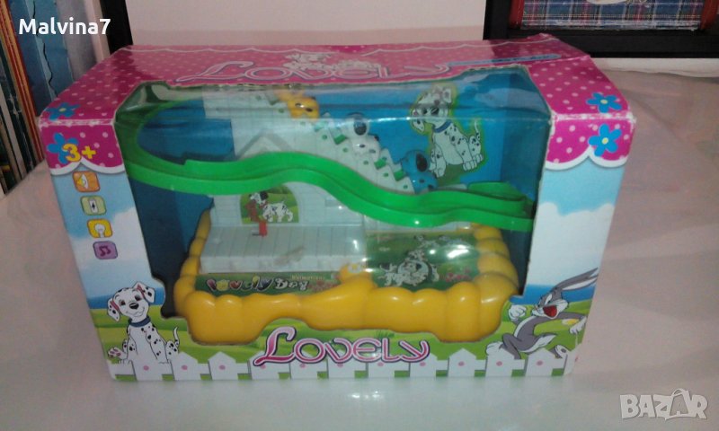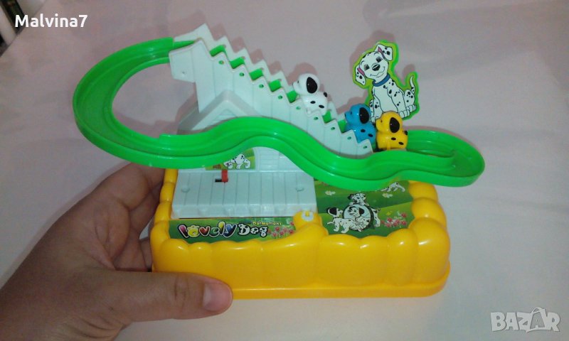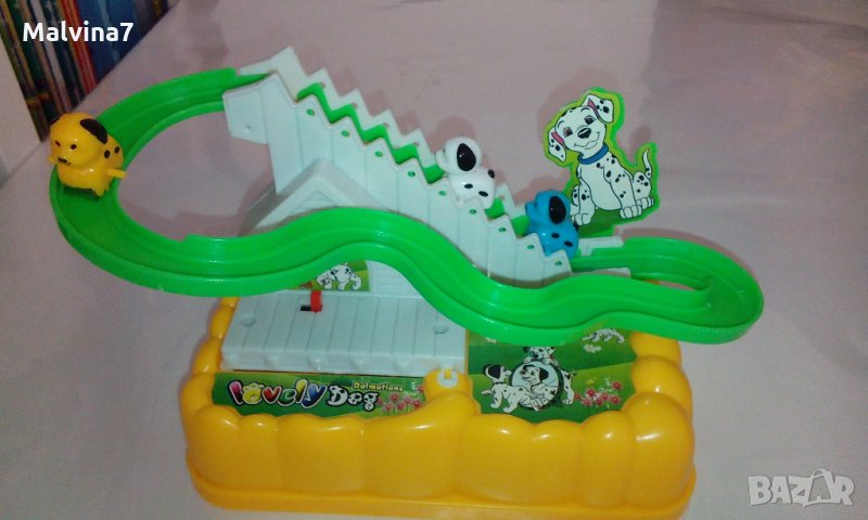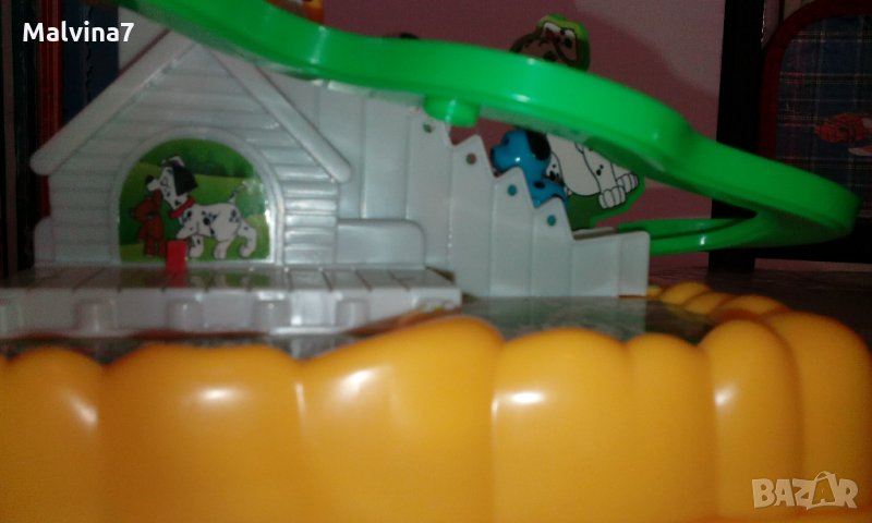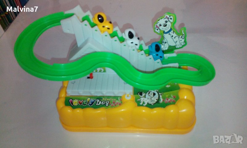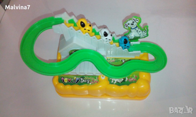 Много забавна музикална играчка с кученца, които сами се изкачват по стълбичката на пързалката и след това се спускат по нея. Песничката е много весела, има и светлинка, и децата много се забавляват. Играчката е много запазена, в оригиналната кутия.