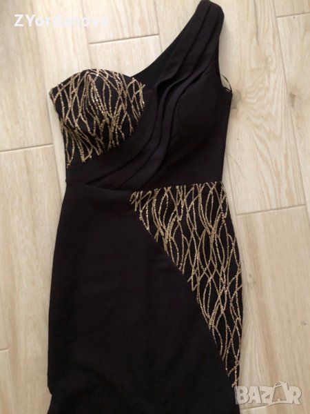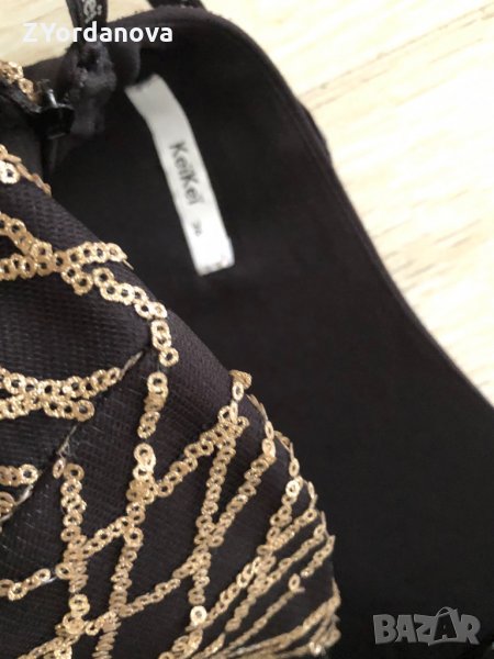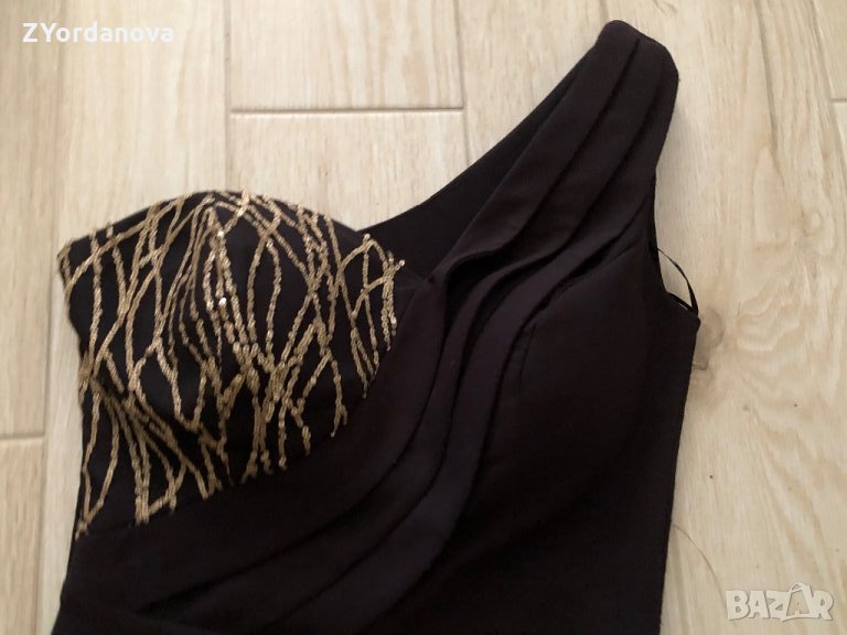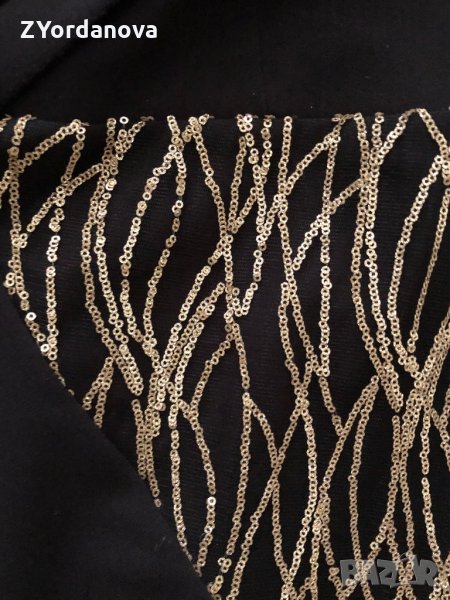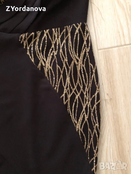 Силно вталена кройка тип русалка с красиво оформено бюстие в горната част. Декорирана със златни блестящи паетки на талията и бюстието.
