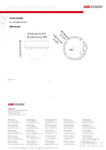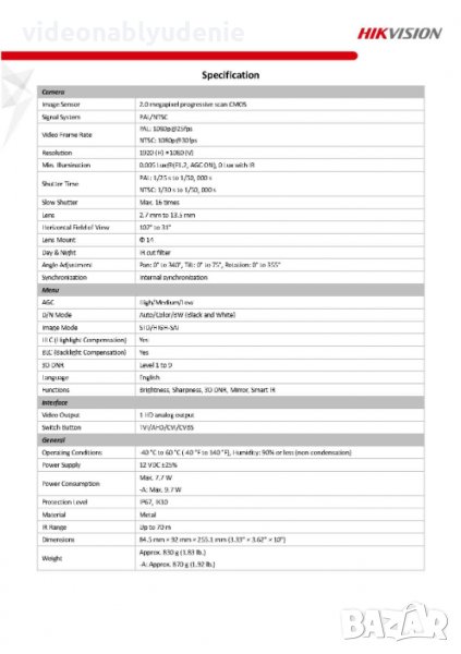 Минимално осветление (лукс): през деня 0.005 Lux@(F1.2, AGC ON), 0 Lux при включено IR за нощно виждане