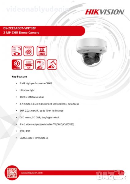Вандалоустойчив Hikvision DS-2CE5AD0T-VPIT3ZF 2.7-13.5мм Моторизиран Варифокал 70Метра Нощно Виждане