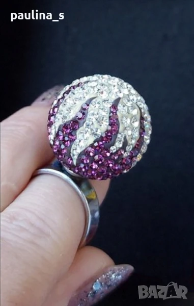 2️⃣ Сребърен пръстен "Swarovski" лилаво - бял / проба 925, топка с кристали Swarovski в лилаво и бяло. Цената е крайна 140,99лв / 70 евро . Кристалите са безпогрешно различими, двойно Маркиран и с Житен клас. Пръстенът е нов и може да се използва за събитие и подарък, много е ефектен. Размер 17мм, но се регулира. Диаметър на топката 22мм.