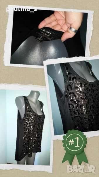 2️⃣. Колаж / XL / 3XL - "Nicole" by Nicole Miller. Цената е крайна 24,99лв / 12,5 евро. Черна, декорирана с пайети туника, с издължена задна част. Моделът е леко разкроен долу. Материята е памук и вискоза, покрива няколко размера. Нова, без дефекти и етикет.