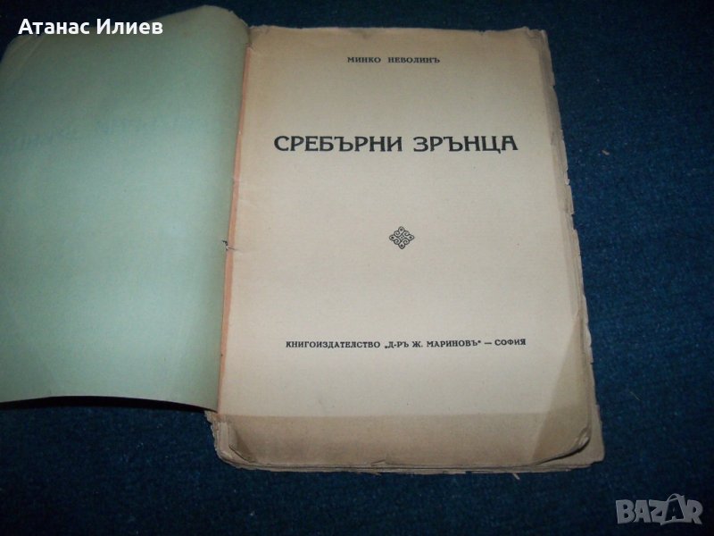 "Сребърни зрънца" стихове от Минко Неволин - бългаски революционер, поет, писател и летописец на Преображенското възстание. Книжката е издадена през 1933г. от книгоиздателство 'д-р Ж. Маринов" София и отпечатана в печатница Доверие. Книгата е с меки корици, 48 стр. Книгата е с оръфани страници но е в добро състояние. От долната страна страниците не са подрязани .