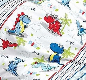 Калъфките за възглавница се затварят тип плик.Едната калъфка е едноцветна в син цвят. Другата калъфка е с картинка динозавър, както са показани на снимката.