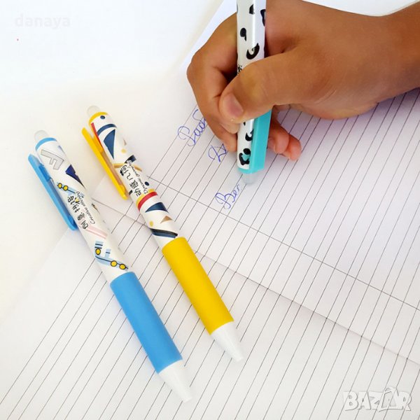 Син химикал с изтриващо се мастило и гумичка в края си. Изтрива се много лесно и бързо и не оставя следи. Особено подходящ за деца от началните класове, за решаване на кръстословици, судоку или писане на лични бележки. Химикалите се предлагат в много свеж цветен принт. Гумирано покритие в долната част, непозволяващо хлъзгане на ръката.