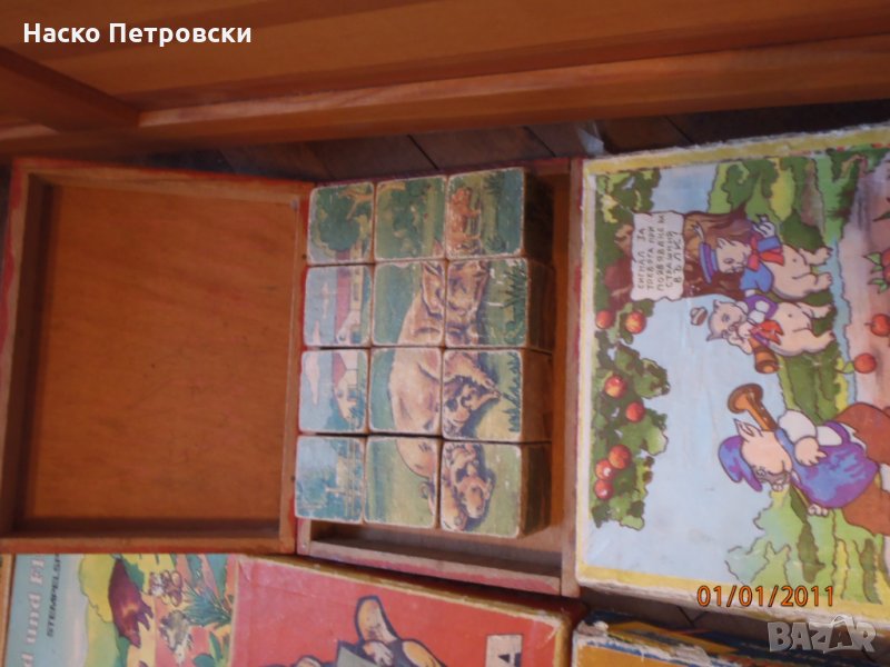 Дървени кубчета български и чуждестранни с картинки за нареждане – в дървената и картонените кутии.