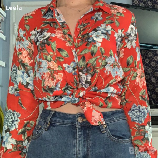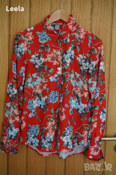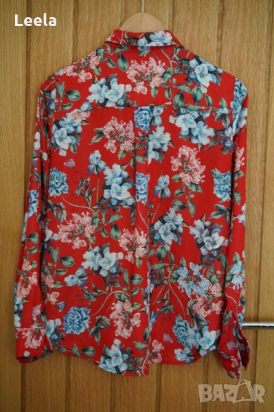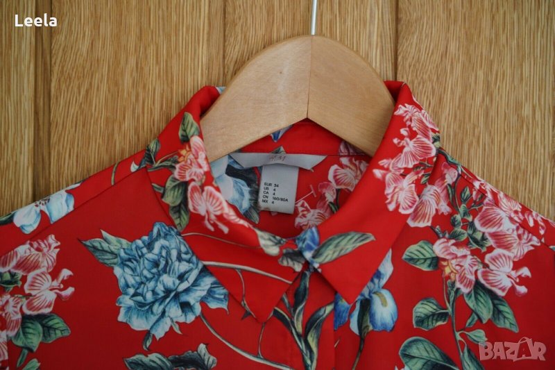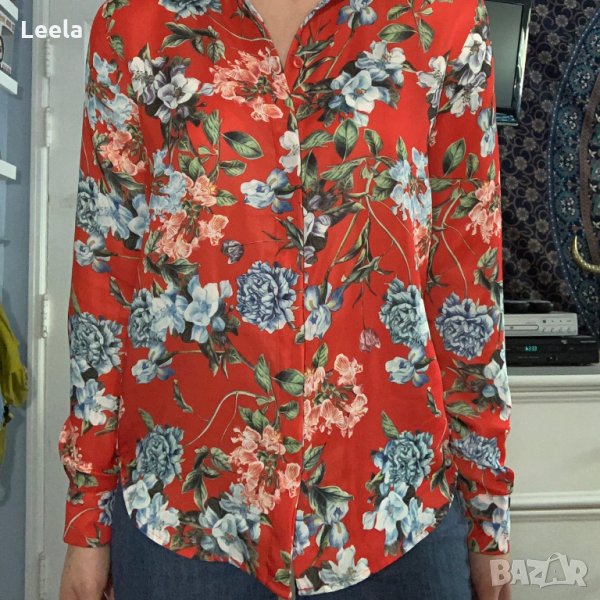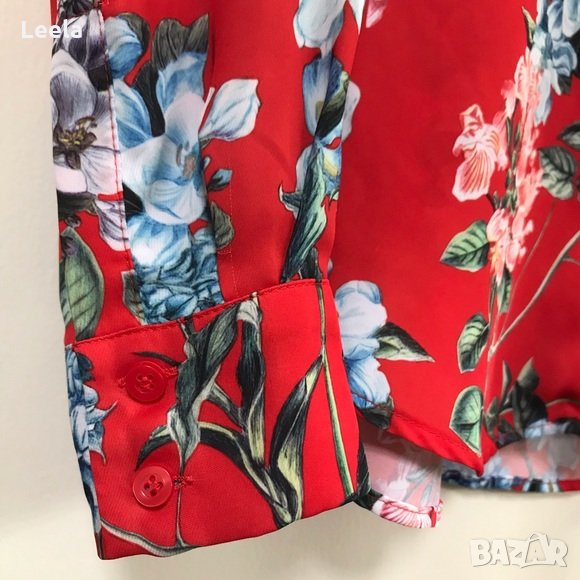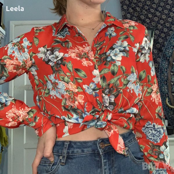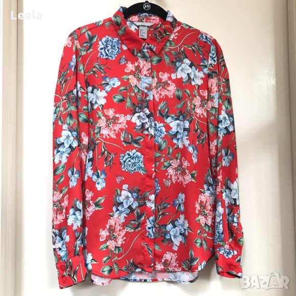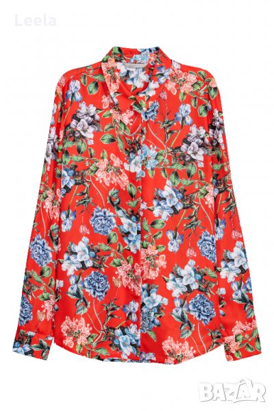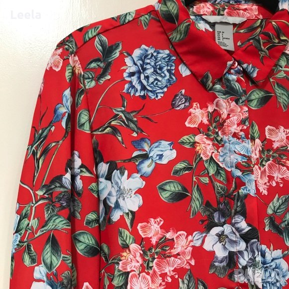 Аленочервена флорална риза на H&M от леко драпирана ефирна материя с яка, скрити копчета отпред и платка с плоха на гърба. С дълги свободни ръкави с копчета на маншетите и заоблен долен край.