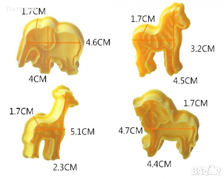 Описание: Пластмасови резци с метално бутало за рязане и щамповане на фондан или сладки или украсяване на торти, сладки и бисквити с фондан, захарно тесто и др. - 4 бр. 4 бр. животни: лъв, жираф, слон и зебра. За многократна употреба, издръжливи, практични. Лесни за експлоатация и почистване. Да се държат далече от открит огън, котлони или фурни.