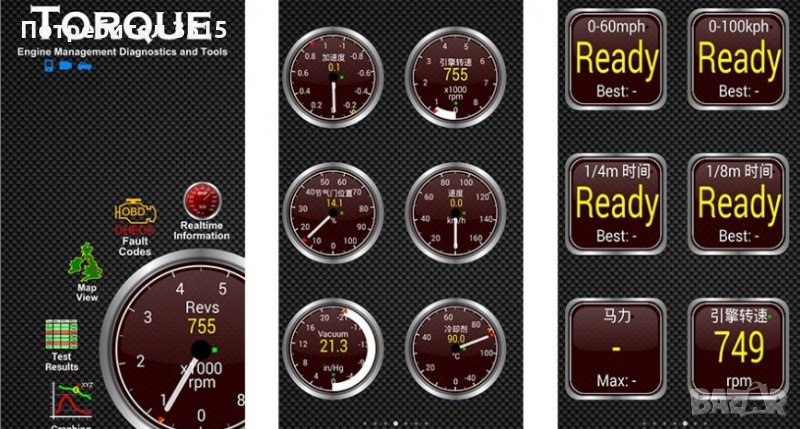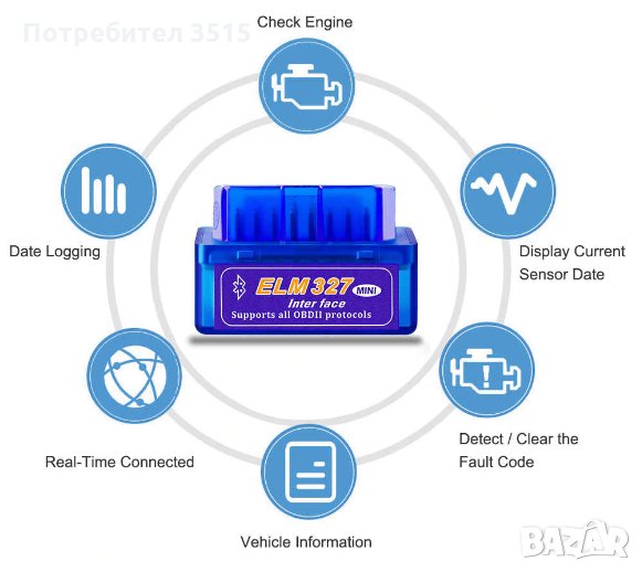 Включва се към OBD2 куплунга на автомобила. Връзката към телефона , таблета или лаптопа - чрез блутут.