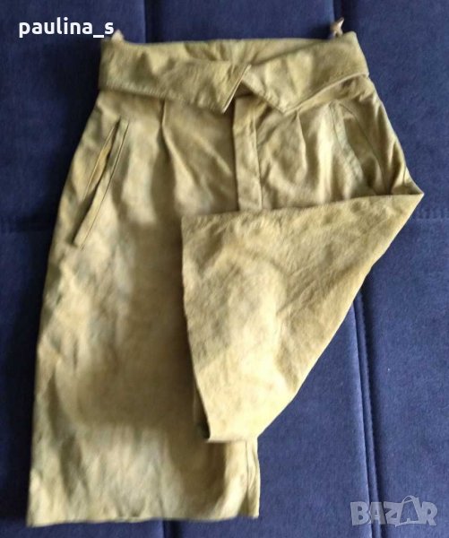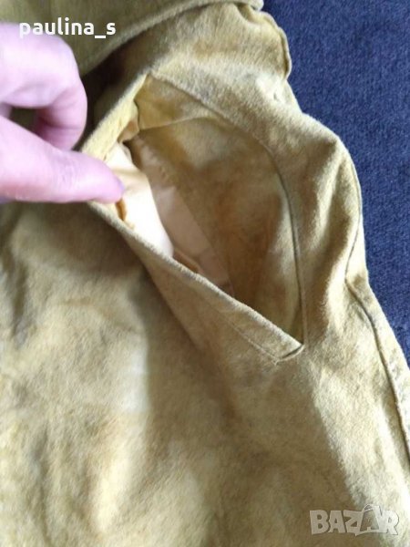 велур с висока талия, в цвят "Горчица". Модел е с басти и джобове с филетки. Без забележки. (При желание, може да се дадат на химическо чистене или да се изперат с шампоан, за да не се повреди цвета).