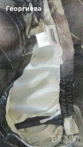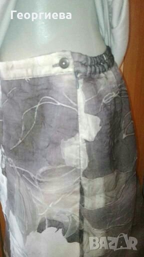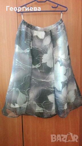 Полата е също страхотна - в сиво, бяло и съвсем леко бледо лила.Има лек блясък.Подплатата е гладка, бяла, а повърхностния плат е тюл в съчетание с плат.Талията обхваща от 41 до 44см.едностранно., дължината е миди.