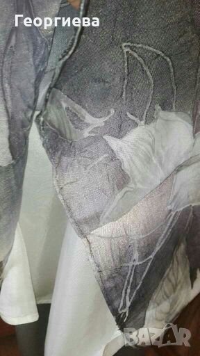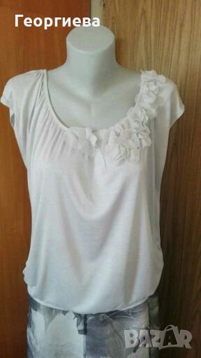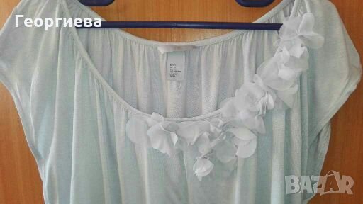 Много нежни, нови, без хартиени етикети.Цветовете са като на снимките.Блузката е на H&M и пише на етикета S р-р, но е уголемена и широчината под мишниците е 60см.+ еластичност.Цветът ѝ е между сиво и синьо - много приятен и много си подхожда с цветовете на полата.Украсата е от тюлени цветчета.