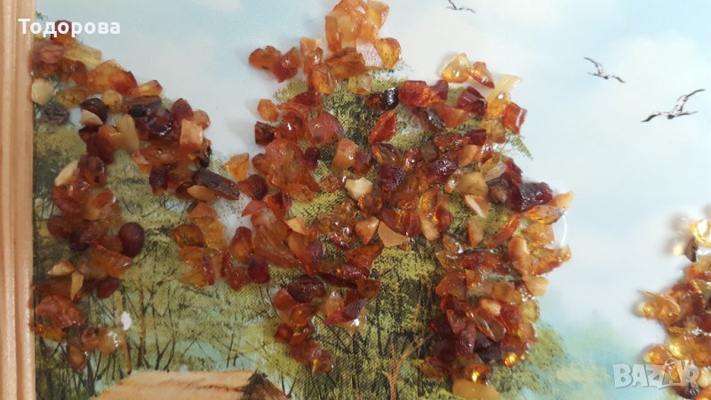 Картина с лечебни свойства.Репродукция на пейзаж,наслоен с късове от естествен кехлибар,оказващ здравословен ефект.Размери- 23 х 32 см.