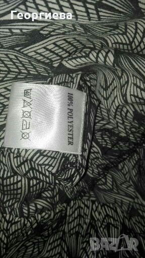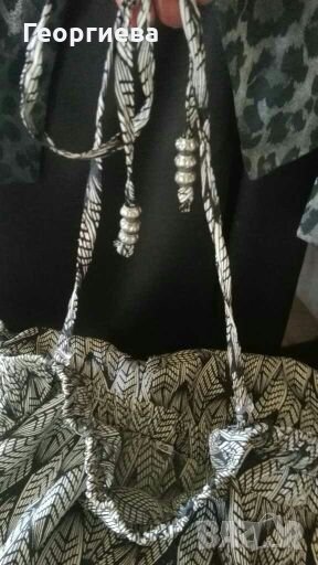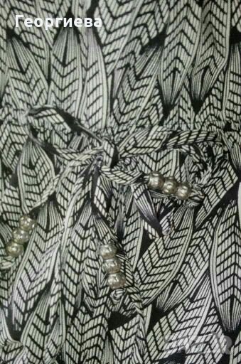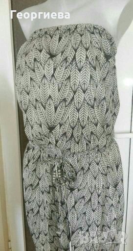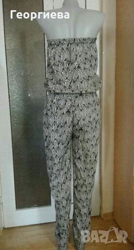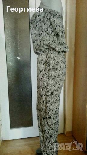 Чисто нов, много лека материя(полиестер).Много е красив на живо!Материята е лрка и гладка и гащеризонът е подходящ и за повод.Може да се носи с и без презрамки - има презрамки с кукички, които се завързват през врата.Шнурчето на колана, както и презрамките, имат украса от сребристи топчета.Най-горе и при талията има ластици, които се разпъват много и дрехата обхваща голям диапазон от размери.