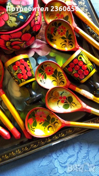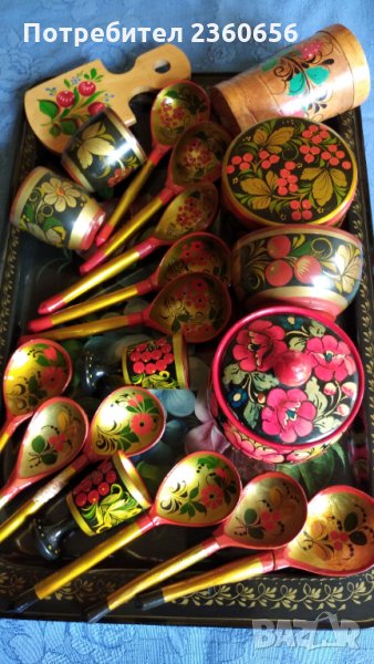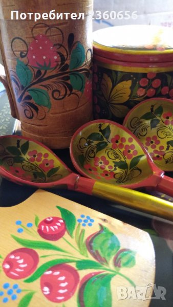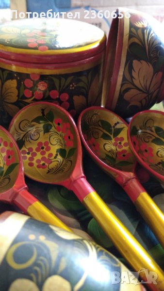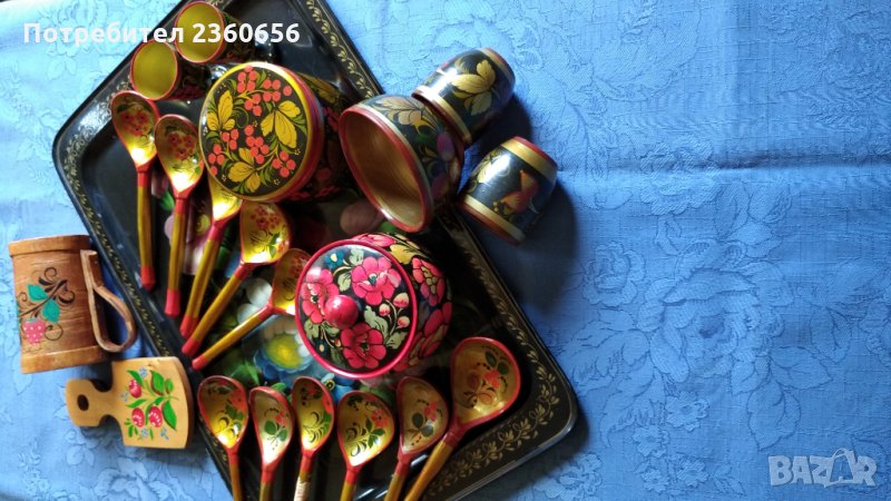 Дървени ръчно рисувани. Купички с капачета по 15 лв.бройка , купичка без капаче - 10 лв. Чашки по 4 лв. И лъжици по 8 лв. едната.