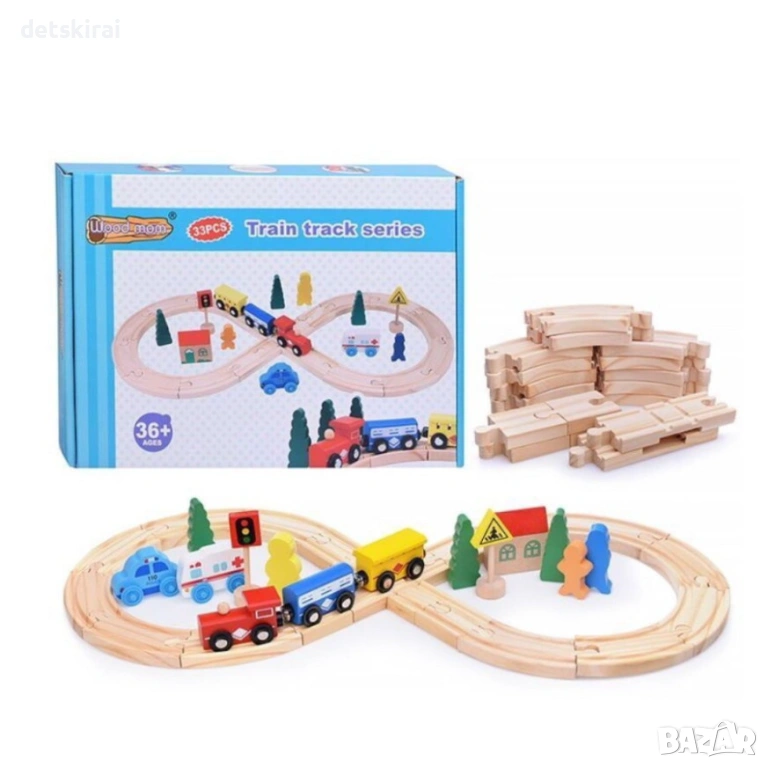 Комплектът съдържа сглобяем ресов път, локомотив, два вагона, ЖП гара, кола, линейка, пътен знак, светофар, дърво и пътници.